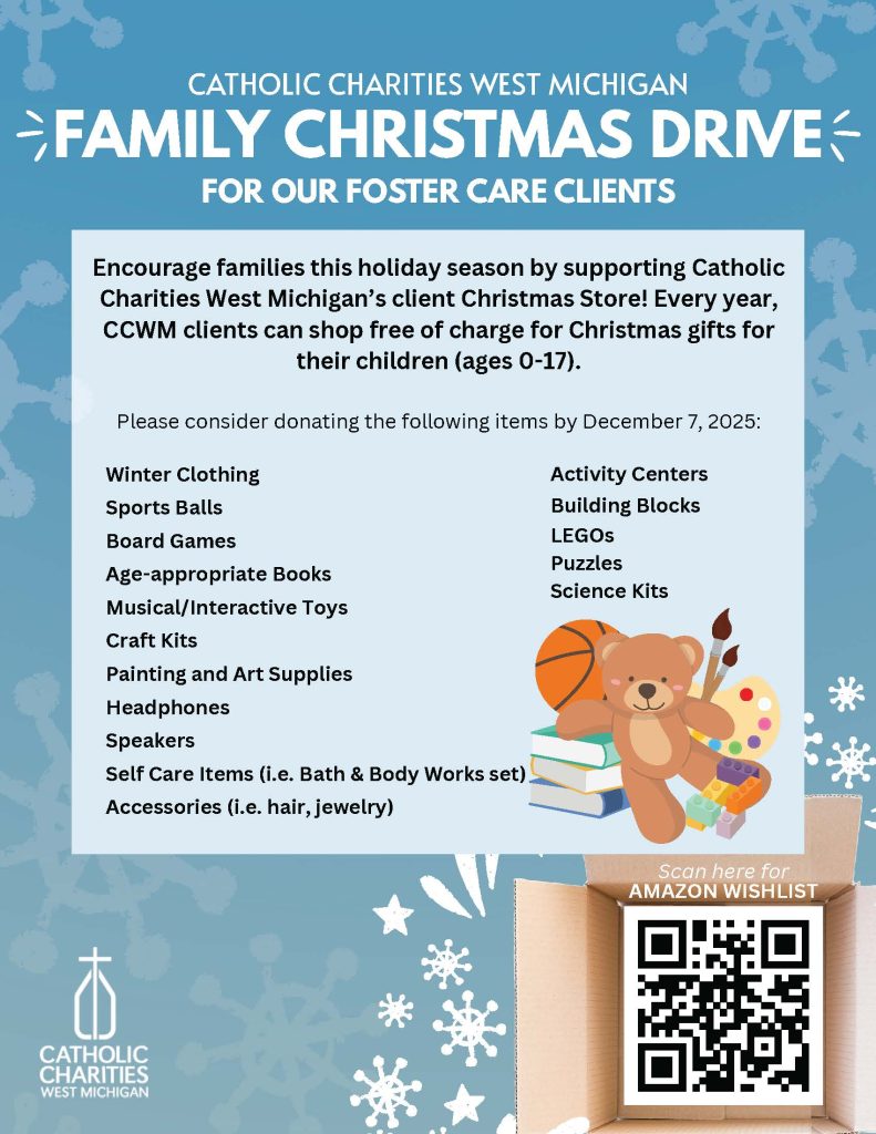Take a peek at the Giving Tree list of gifts to purchase and donate for the Catholic Charities West Michigan Foster Families. Unwrapped gifts can be dropped off in the Narthex no later then December 7th! Thank you so much for helping to support this wonderful community outreach!