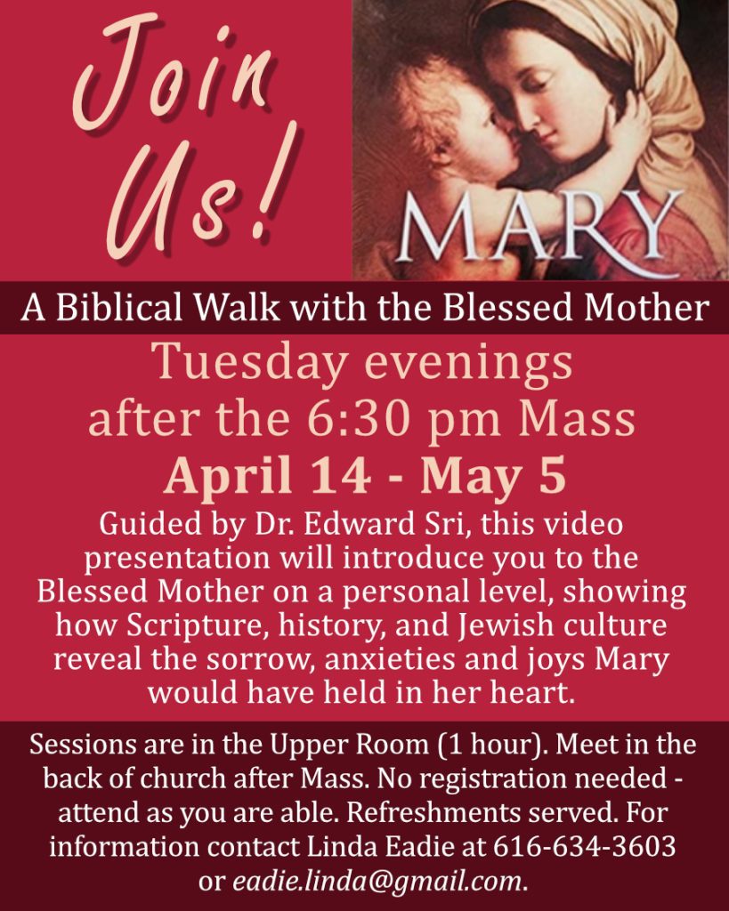 Join us for MARY – A BIBLICAL WALK WITH THE BLESSED MOTHER. Tuesday evenings after the 6:30 pm Mass. April 14 – May 5. Guided by Dr. Edward Sri, this video series will introduce you to the Blessed Mother on a personal level showing how Scripture, history, and Jewish culture impacted her life. Sessions are in the Upper Room (1 hr.). Meet in the back of church after Mass. No registration needed. Come as you are able. Information – Linda Eadie at 616-634-3603 or eadie.linda@gmail.com.
